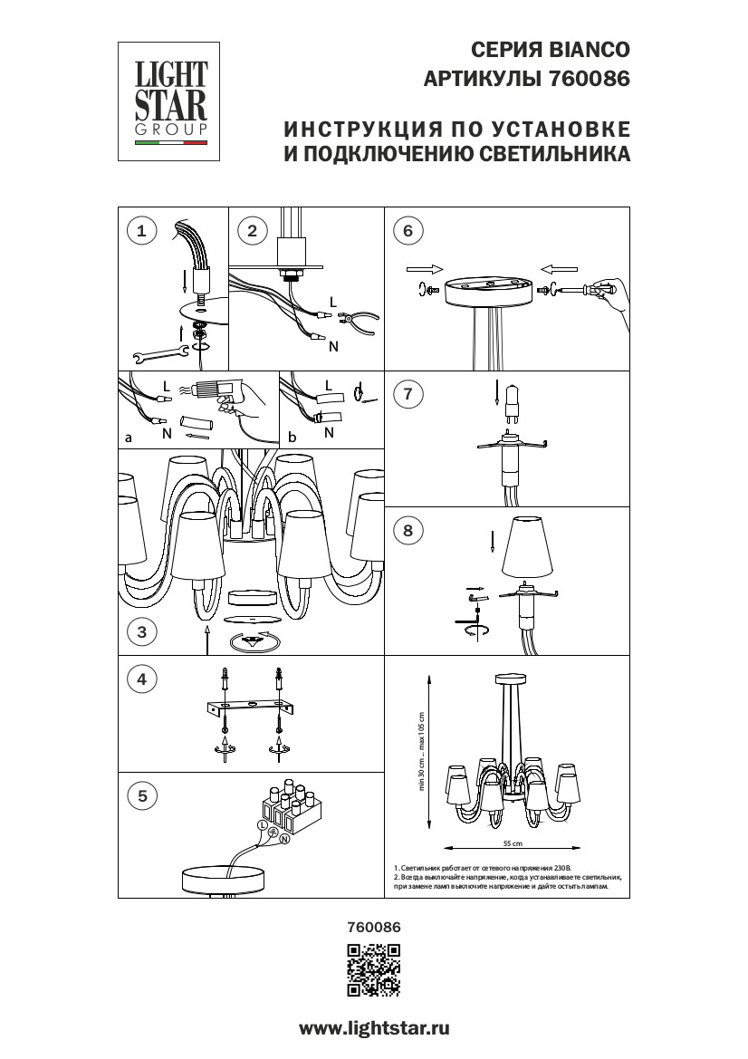 Высота min-max (см): 30-105; Ширина (см): 55; Вес (кг): 4,3; Кол-во ламп: 8xG9; Мощность max (W): 40; Цвет основания/цвет стекла или абажура: Chrome / Crystal white;